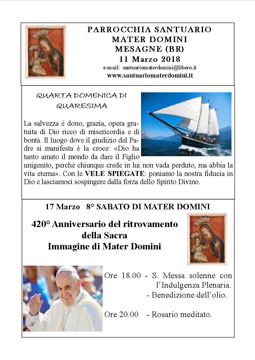 Buona domenica a tutti voi, amici vicini e lontani. Ecco a l’ultima edizione del MaterDomini News con le riflessioni di Don Pietro sulla quarta domenica di Quaresima e gli appuntamenti della settimana. Sabato festeggeremo il 420° anniversario del ritrovamento della sacra immagine di Maria Ss.ma Mater Domini. Buona lettura 😉