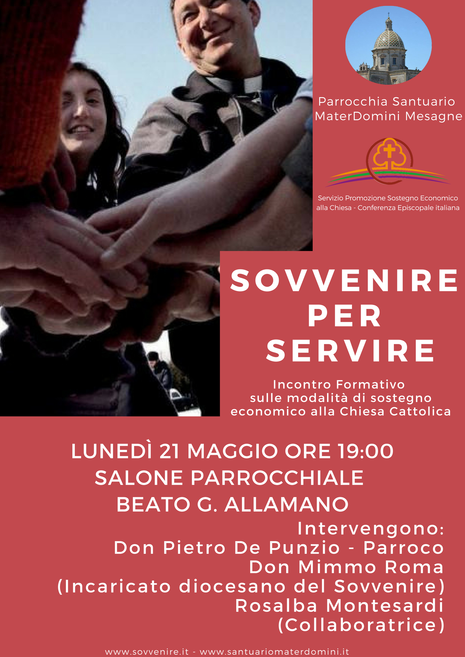 Negli scorsi giorni tutti gli incaricati diocesani del Sovvenire si sono confrontati nell’annuale convegno nazionale. Mons. Donato Negro presidente del Comitato C.E.I. per il Sovvenire ha dichiarato che è importante “Formare e animare il territorio creando relazioni di fiducia con le persone, manifestando le esigenze della Chiesa, chiedendo con semplicità”. All’incontro di lunedì 21 maggio alle ore 19:00 interverranno Don Mimmo Roma incaricato diocesano del Sovvenire e la collaboratrice Rosalba Montesardi. L’ingresso è libero, possono partecipare adulti e ragazzi, e saranno distribuiti gadget e materiale informativo.